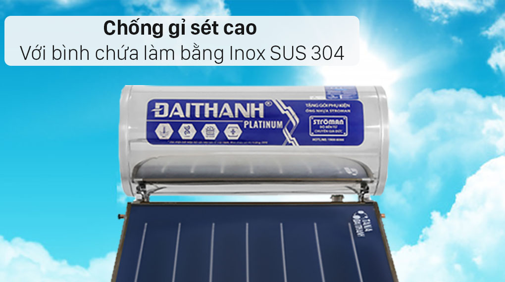 Ruột bình bảo ôn của máy nước nóng năng lượng mặt trời Đại Thành được làm bằng inox 304 nhập khẩu với thành phần từ Crom và Niken . Đảm bảo có độ bền vượt trội, không rỉ sét, không bám cặn bẩn. Loại vật liệu này phù hợp với nguồn nước tiêu chuẩn hiện nay, giúp bảo vệ sức khỏe mọi người.