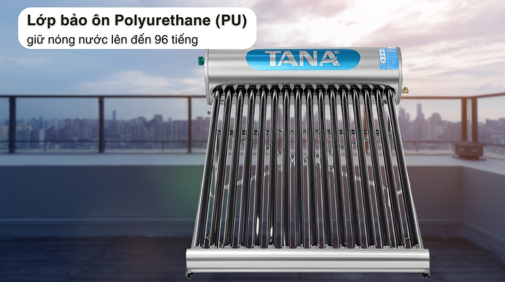 Máy nước nóng năng lượng mặt trời được trang bị lớp cách nhiệt Polyurethane dày, bao bọc bên ngoài bình chứa giúp hạn chế thất thoát nhiệt. Nhờ đó, nước nóng có thể được giữ ở mức nhiệt ổn định đến 96 tiếng (khoảng 4 ngày) và gia đình bạn có thể sử dụng cả khi thời tiết nhiều mây hoặc buổi tối không có nắng.