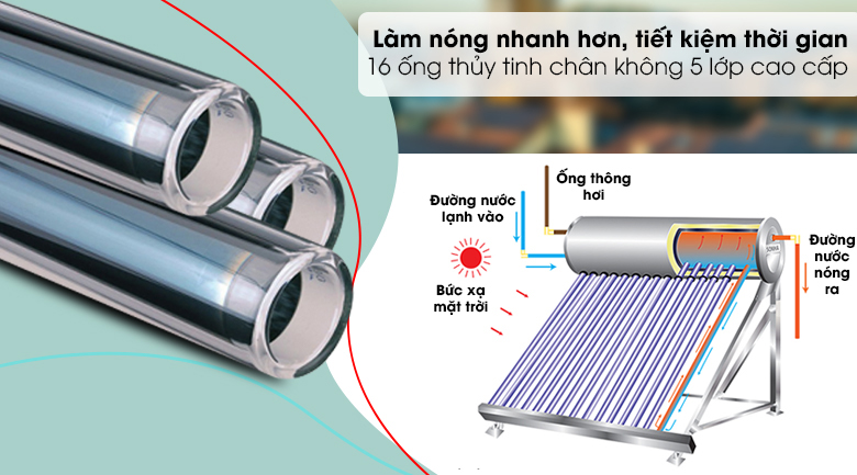 Máy nước nóng năng lượng mặt trời này có khả năng hấp thụ nhiệt tốt, làm nước nóng nhanh (chỉ mất 2,5 - 3 giờ để đun nóng) nhờ trang bị 16 ống chân không 5 lớp chiều dài 1.8m.