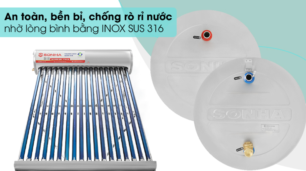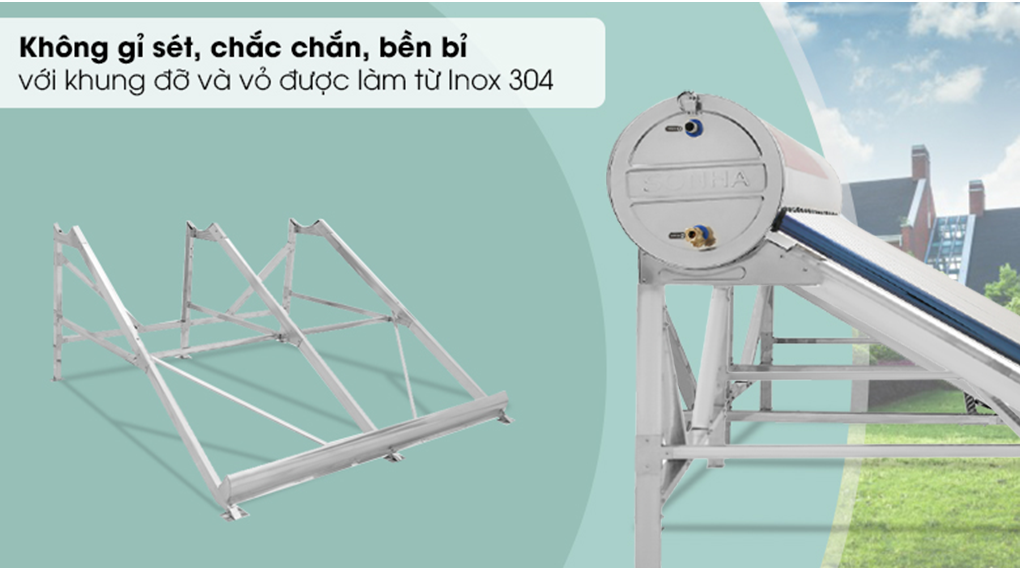 An toàn, chắc chắn hơn khi máy nước nóng Sơn Hà được thiết kế chân khung đỡ và vỏ bình được làm từ inox 304 cao cấp an toàn, bền bỉ, thích hợp với những nơi có khí hậu khắc nghiệt, vùng nước ven biển bị nhiễm mặn,...