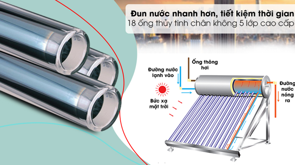 Máy nước nóng năng lượng mặt trời này có 18 ống chân không 5 lớp chiều dài 1.8m nên hấp thụ nhiệt tốt, chỉ cần chờ đợi 2,5 - 3 giờ để đun nước là đã có nước nóng để sử dụng.