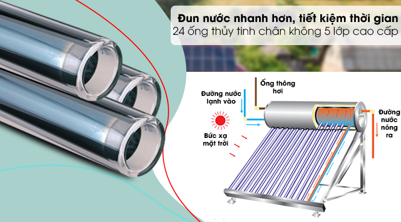 Máy nước nóng này có 24 ống thủy tinh chân không 5 lớp với chiều dài 1.8 m, giúp tăng diện tích hấp thụ được nhiều ánh nắng hơn. Thu nhiệt nhanh chóng và giúp cho thời gian đun nước chỉ 2.5h - 3h là xong trong điều kiện đủ nắng. Và đặc biệt với lớp chống bám cặn thì giúp cho lòng ống luôn sạch sẽ và đảm bảo an toàn cho người dùng.