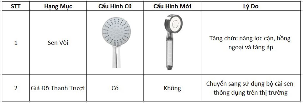 LƯU Ý: Các sản phẩm được sản xuất từ ngày 01/10/2025 sẽ có thay đổi về vòi sen và giá đỡ như sau: