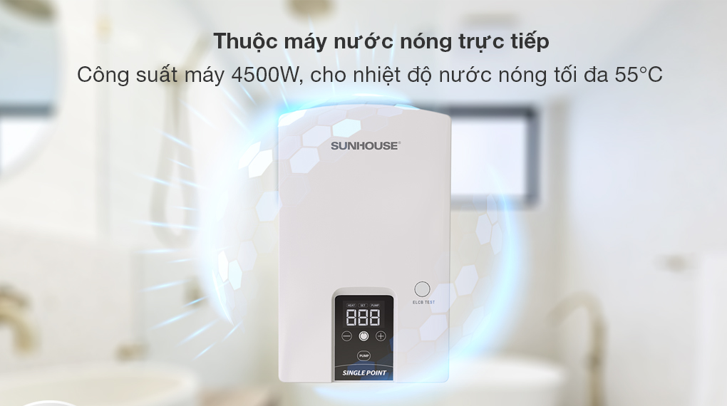 - Sunhouse 4500W SHA-9453EP thuộc máy nước nóng trực tiếp, thường được sử dụng cho các khu vực miền Nam hoặc những nơi có nhiệt độ trên 20°C. Với kiểu máy này, người dùng có thể sử dụng nước nóng dường như ngay lập tức sau khi mở máy.