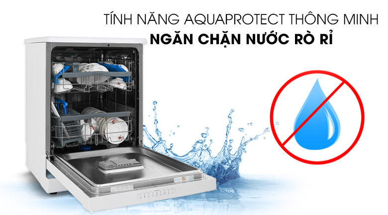 Nhờ có cấu tạo đặc biệt AQUAPROTECT, ống cấp nước tránh được tình trạng rỉ nước dù máy đang trong chu trình hoạt động. Nếu nước rò rỉ từ ống màu đỏ bên trong thì vỏ bọc trong suốt bên ngoài sẽ chứa nước để cho phép chu trình rửa hoàn thành.