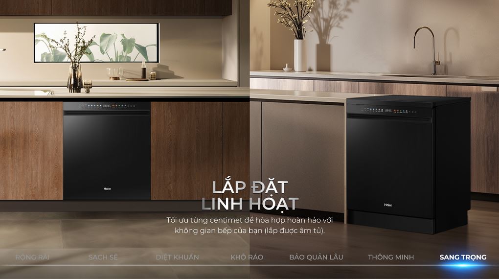 Haier HDWA18-686BK3VN có kiểu dáng độc lập với thân máy vuông vức, dễ bố trí trong nhiều không gian bếp và hỗ trợ lắp đặt linh hoạt theo kiểu lắp dương hoặc lắp âm tùy thiết kế nội thất, cạnh tủ bếp.\