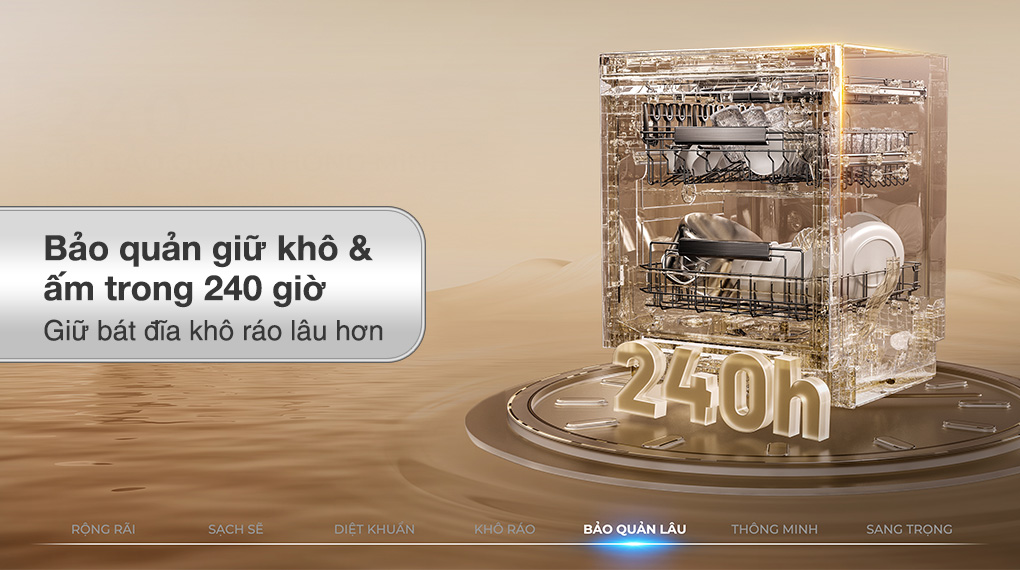 Chế độ bảo quản giữ khô & ấm trong 240 giờ duy trì sự thông thoáng trong khoang rửa, phù hợp khi người dùng chưa lấy chén bát ra ngay sau khi hoàn tất chu trình.
