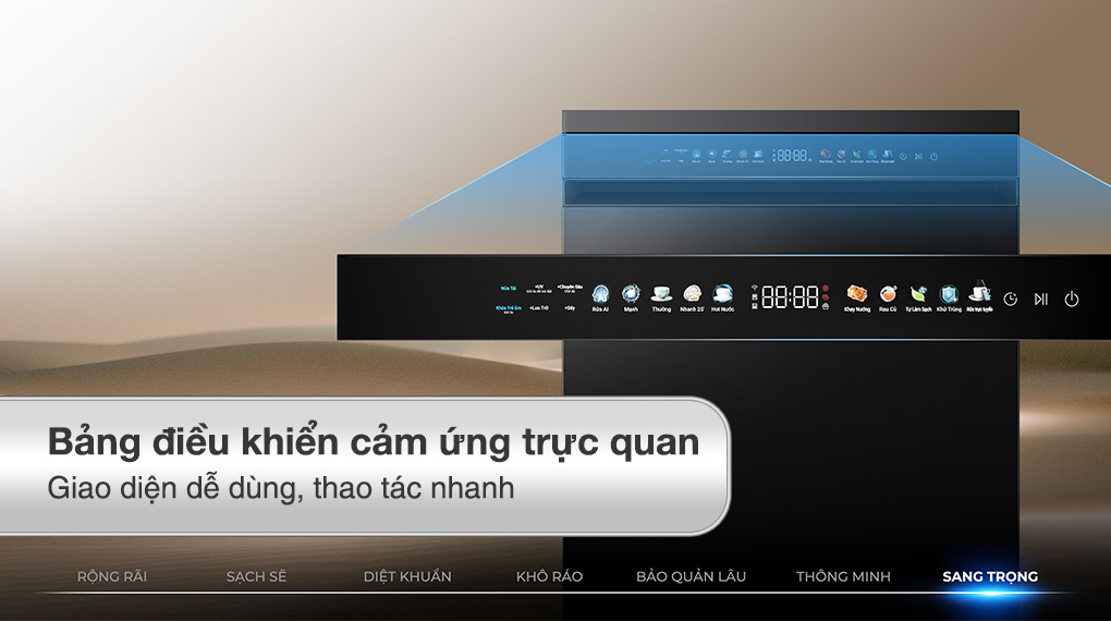 Màn hình LED hiển thị rõ ràng thời gian còn lại, chương trình đang hoạt động và các trạng thái liên quan, giúp người dùng dễ dàng theo dõi tiến trình rửa và chủ động sắp xếp công việc trong bếp.