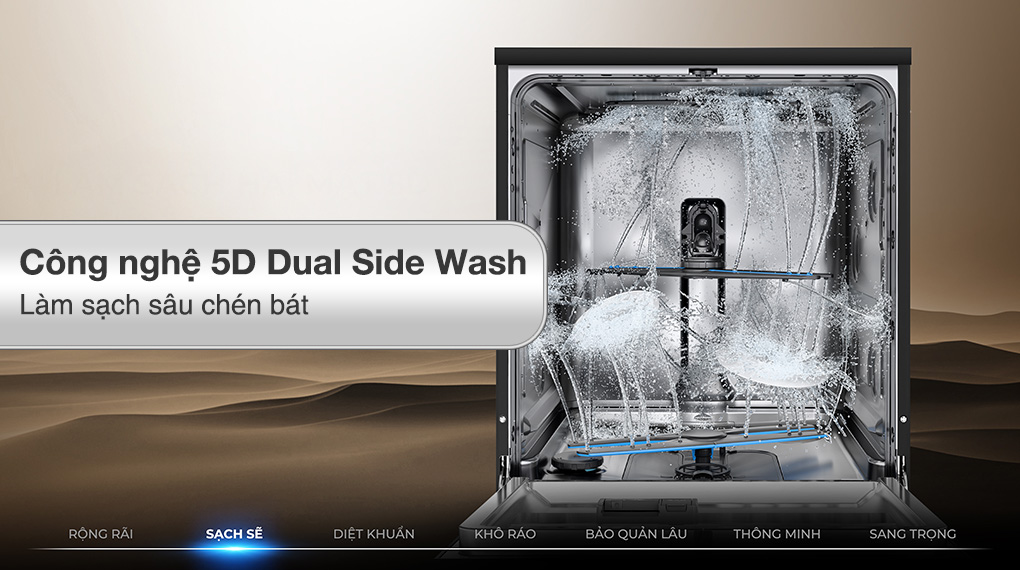 Máy rửa chén Haier ứng dụng công nghệ 5D Dual Side Wash (rửa hai mặt) với hệ thống tia nước đa hướng, hỗ trợ làm sạch đồng thời cả mặt trong và mặt ngoài của chén đĩa, góp phần nâng cao hiệu quả rửa tổng thể.