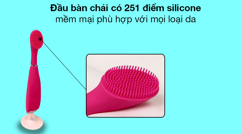Đầu bàn chải có 251 điểm silicone mềm mại phù hợp với mọi loại da, làm sạch sâu lỗ chân lông