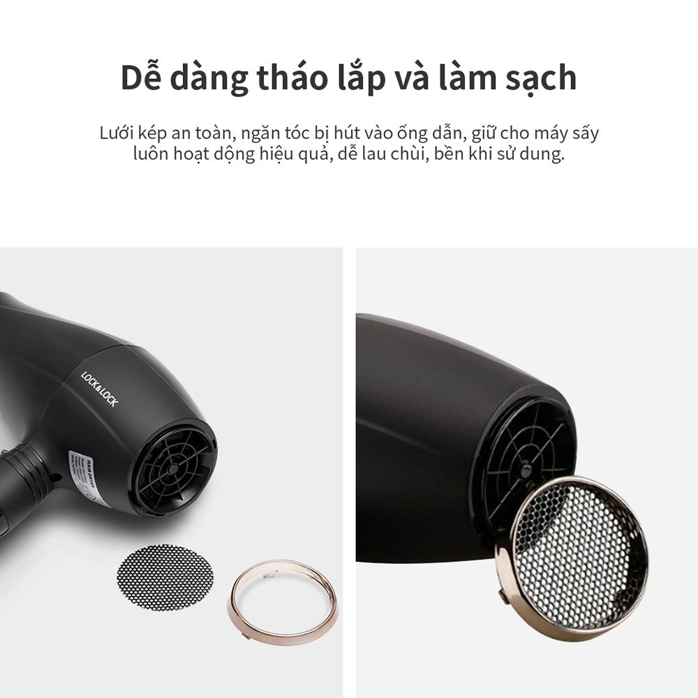 Máy sấy tóc Lock&Lock ENA146BLK được trang bị lưới kép bảo vệ phía sau, ngăn tóc bị hút ngược vào ống dẫn khí, đảm bảo máy hoạt động ổn định và bền bỉ. Bộ lọc này có thể tháo rời hoàn toàn, giúp việc vệ sinh trở nên cực kỳ đơn giản, duy trì hiệu suất hoạt động tốt nhất cho máy.