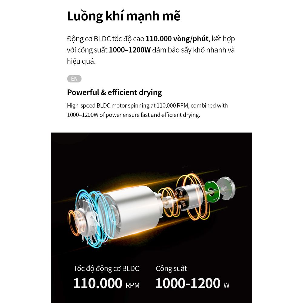Điểm nổi bật của Lock&Lock ENA526GRY chính là động cơ BLDC không chổi than mạnh mẽ, đạt tốc độ quay đáng kinh ngạc 110.000 vòng/phút. Động cơ này tạo ra luồng khí cực mạnh, giúp mái tóc khô nhanh chóng chỉ trong vài phút, tiết kiệm thời gian đáng kể cho những người bận rộn. Đặc biệt, lược chải thẳng có công nghệ sưởi PTC thông minh phân bổ nhiệt đều khắp bề mặt tóc, duy trì nhiệt độ ổn định, loại bỏ nỗi lo tóc bị cháy hay hư tổn do nhiệt độ quá cao.
