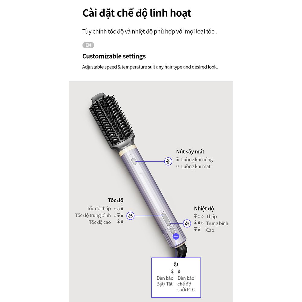 Để đáp ứng mọi nhu cầu và loại tóc khác nhau, Lock&Lock ENA526GRY trang bị 3 tốc độ gió và 3 mức nhiệt độ tùy chỉnh gồm thấp, trung bình và cao. Dù bạn muốn sử dụng luồng khí nóng giúp sấy khô nhanh, tạo kiểu nhẹ nhàng hay cần một luồng gió mát để khóa nếp tóc, chiếc máy này đều có thể đáp ứng hoàn hảo. Chế độ sấy mát đặc biệt hữu ích để cố định kiểu tóc và giảm thiểu tác động nhiệt, giữ cho tóc luôn bồng bềnh và khỏe mạnh. Một chiếc máy sấy tóc linh hoạt sẽ mang lại hiệu quả cao giúp cá nhân hóa trải nghiệm sấy tóc theo nhu cầu riêng của mình