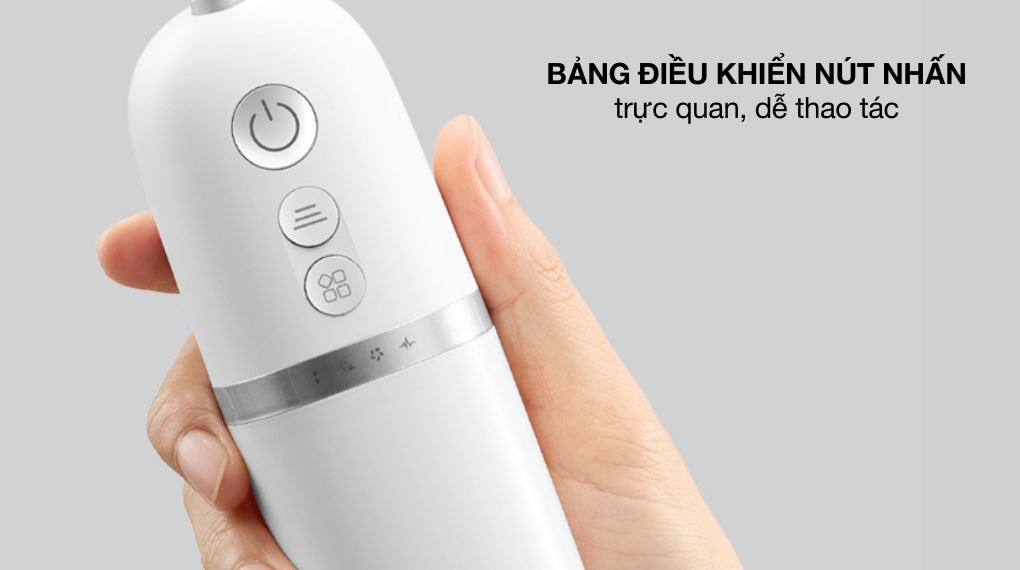 - Bảng điều khiển máy sử dụng nút nhấn và hệ thống đèn báo giúp người dùng dễ theo dõi chế độ, cường độ và dung lượng pin.