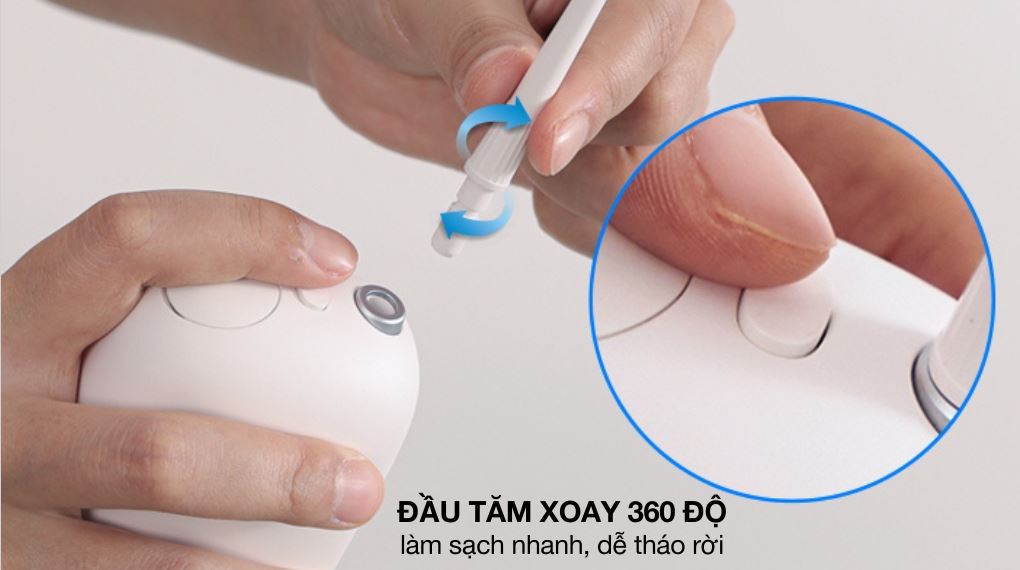 + Đầu tăm xoay linh hoạt 360 độ: thiết kế đầu tăm có thể xoay tròn, giúp bạn dễ dàng đưa tia nước tiếp cận vào mọi ngóc ngách trong khoang miệng, đặc biệt hiệu quả khi làm sạch vùng răng hàm, mặt trong răng và dọc theo đường viền nướu.