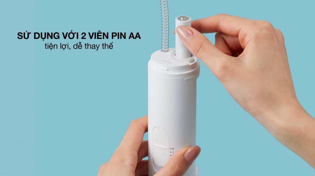 Máy sử dụng 2 viên pin AA Alkaline nên rất dễ thay thế, không cần sạc điện, nhờ đó bạn có thể sử dụng tăm nước từ 18 đến 20 ngày, rất phù hợp cho những chuyến đi xa.