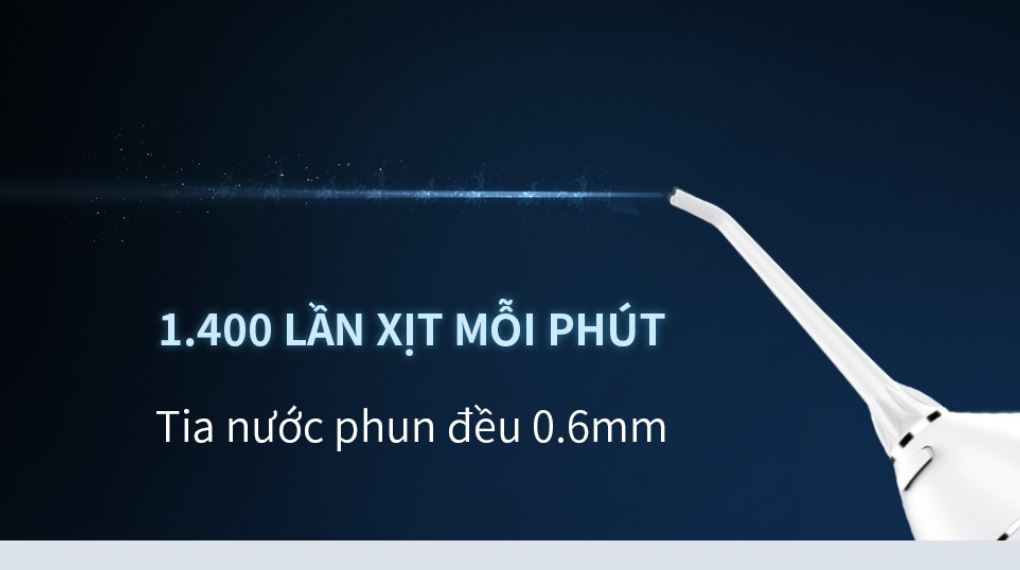 - Áp lực tia nước linh hoạt từ 40 - 90 PSI, kết hợp cùng tốc độ phun 1400 lần/phút, giúp loại bỏ cặn thức ăn, mảng bám và vi khuẩn hiệu quả, đặc biệt ở các vùng răng khó tiếp cận như kẽ răng, mặt trong răng hàm.