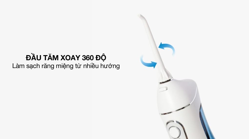- Đầu tăm nước có thể xoay 360 độ hỗ trợ điều chỉnh linh hoạt hướng tia nước, làm sạch hiệu quả từng kẽ răng và vùng nướu mà không cần xoay cổ tay nhiều.