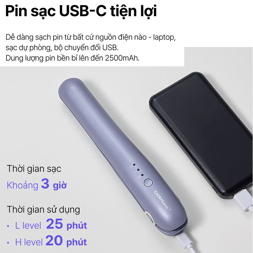 Thời gian sạc khoảng 3 giờ, nhưng có thể thay đổi tùy điều kiện sạc và nhiệt độ môi trường. Cổng sạc USB type-C giúp quá trình nạp pin trở nên linh hoạt hơn, tương thích với nhiều thiết bị như laptop, pin dự phòng, adapter USB,… Công suất 15W giúp máy nóng lên nhanh, đáp ứng tốt cho những lần chỉnh tóc gấp rút trước khi ra ngoài.