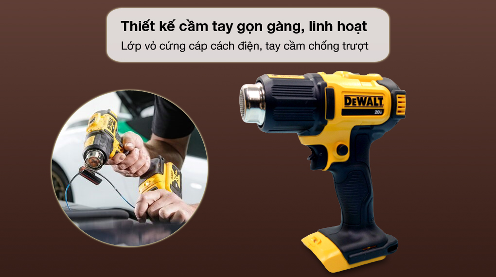 Máy thổi hơi nóng dùng pin Dewalt DCE530N-KR 18V nhỏ gọn, hoạt động với mức nhiệt cao nhanh chóng thổi bụi, làm khô các bề mặt khò, hoạt động mạnh mẽ và ổn định trong thời gian dài.