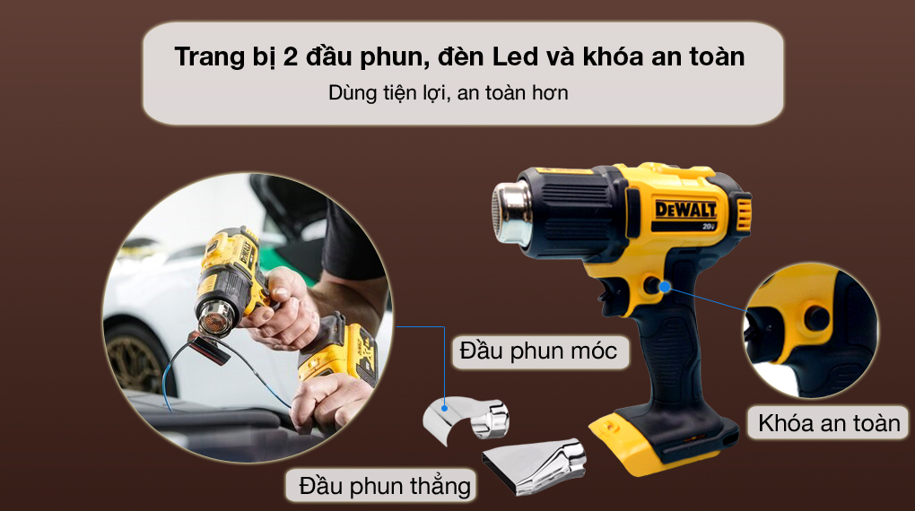 - Máy thổi hơi nóng dùng pin Dewalt DCE530N-KR 18V gồm phụ kiện 1 đầu phun thẳng và 1 đầu phun móc để dùng tốt cả ở những góc hẹp.