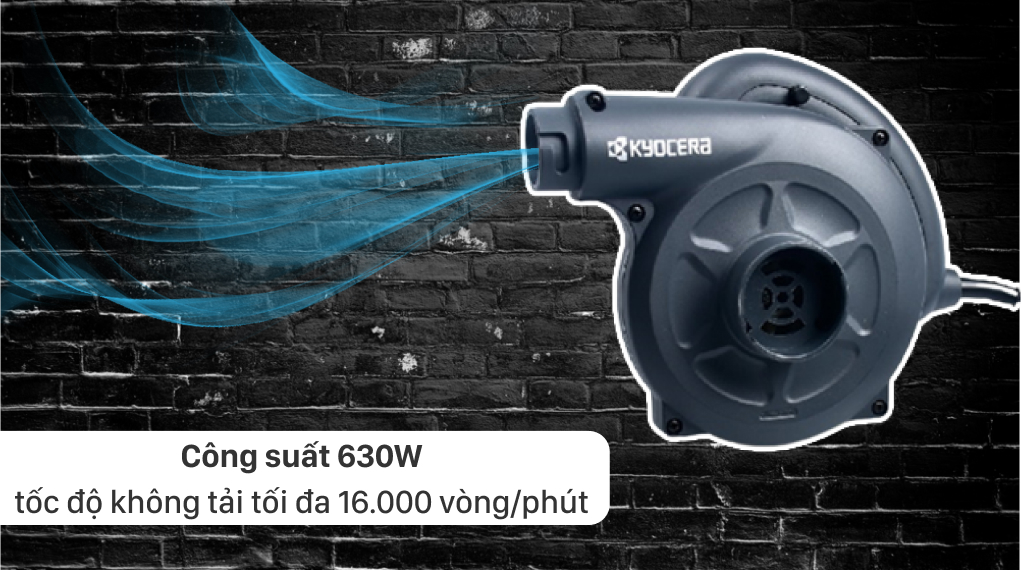 - Máy thổi bụi Kyocera sở hữu công suất 630W kết hợp với tốc độ không tải đầu vào đạt đến 16.000 vòng/phút giúp thổi nhanh bụi bẩn trên bề mặt, phục vụ đa dạng các tính chất công việc.