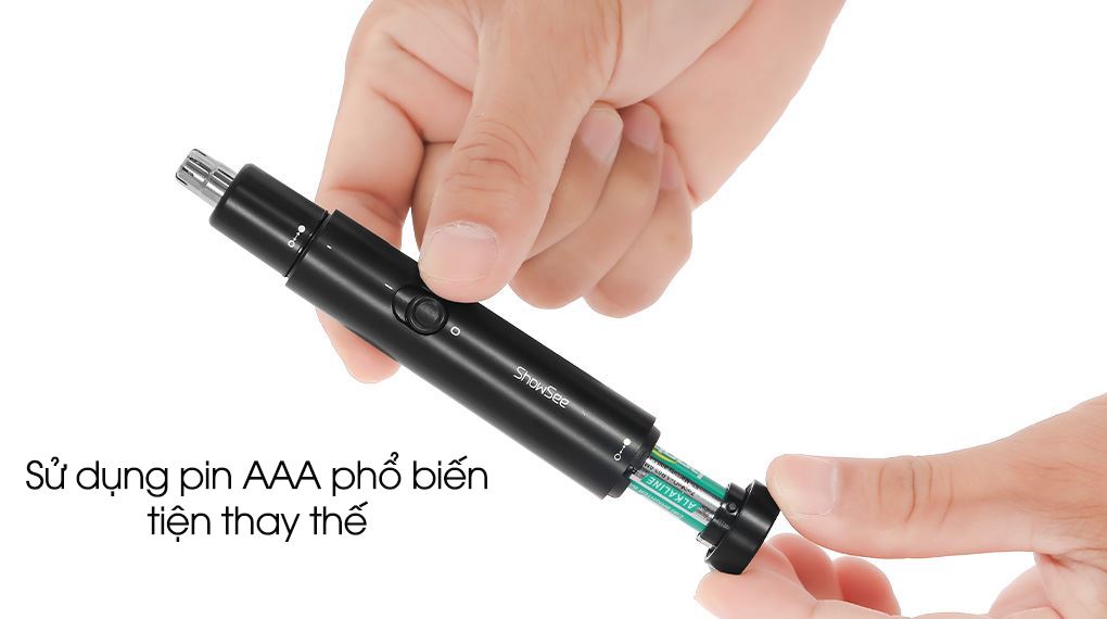 - Máy tỉa lông mũi Showsee dùng pin AAA phổ biến, dễ tìm mua và thay thế.