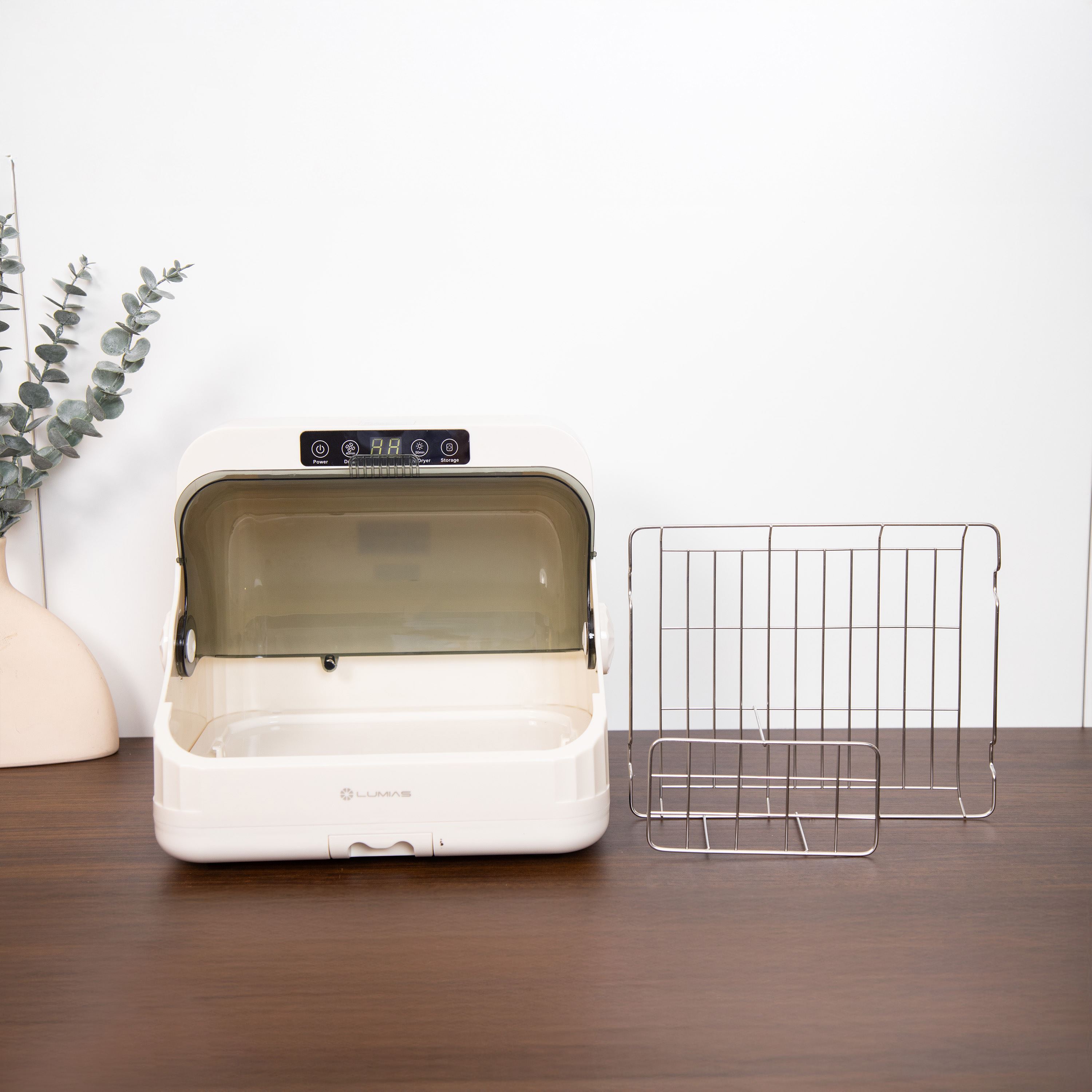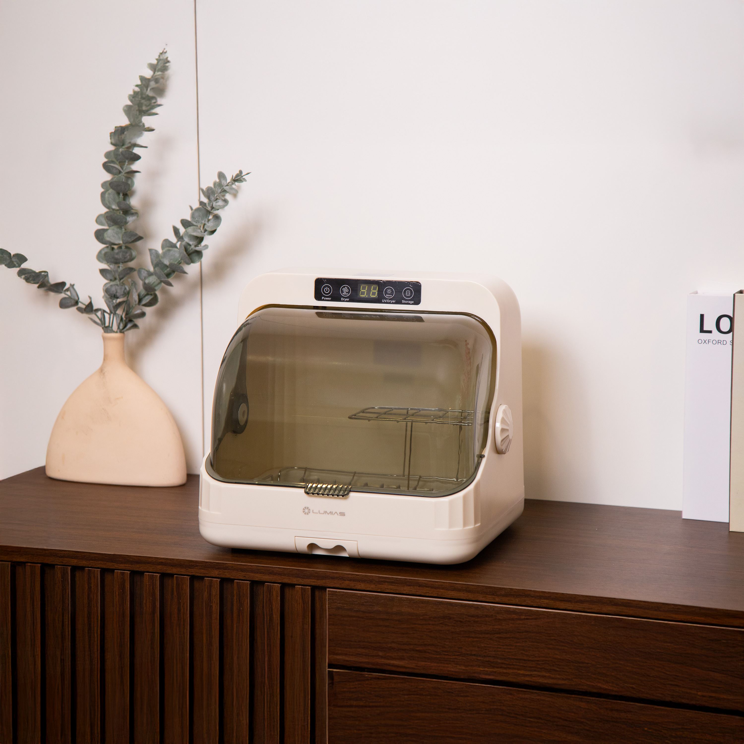 Máy sấy tiệt trùng LUMIAS có thiết kế nắp đậy trong suốt, với kích thước nhỏ gọn (cao 29 cm, rộng 30 cm, sâu 26.5 cm), không chiếm nhiều diện tích sử dụng. Vật liệu cấu tạo gồm nhựa ABS, PP và thép không gỉ SUS304. Khoang chứa dung tích 20 lít, tiệt trùng tối đa 6 bình sữa và 1 núm ti trong một lần. Máy có hộp chứa nước tích hợp và khả năng giữ vô trùng sau khi tiệt trùng trong vòng 24 giờ (khi không mở nắp). Máy sử dụng công nghệ tiệt trùng bằng tia UV. Có thể lựa chọn giữa chế độ sấy khô + UV trong 50 phút hoặc chỉ sấy khô trong 40 phút tùy theo nhu cầu.