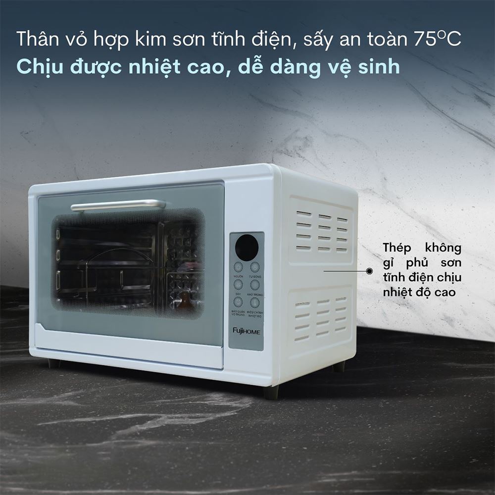 Máy tiệt trùng FUJIHOME có thiết kế hình hộp chữ nhật tối giản với sắc trắng tinh tế, phù hợp với nhiều không gian bếp. Kích thước tủ là rộng 46 cm - cao 31 cm - sâu 31.5 cm và khối lượng 4.7 kg, khá nhỏ gọn.