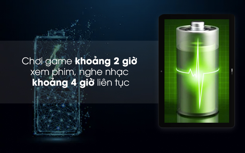 Với dung lượng viên pin cực lớn lên đến 5100 mAh giúp cho thời gian sử dụng máy tính bảng của bạn vô cùng thoải mái khi bạn có thể xem phim liên tục trong khoảng 3 giờ, chơi game trong 2 giờ hoặc sử dụng những tác vụ cơ bản như nghe nhạc, lướt face, đọc báo,... lên đến 24h thuận tiện để bạn mang theo bên mình khi đi du lịch, dã ngoại.