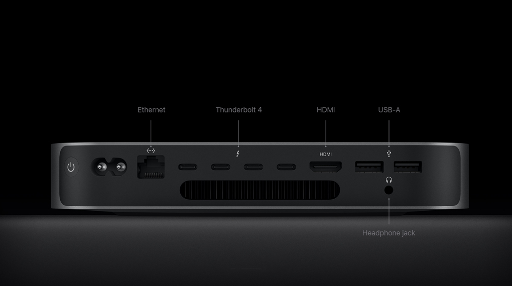 Mac mini tiếp tục được trang bị đa dạng các cổng kết nối phổ biến, trong đó có 4 cổng Thunderbolt 4 với tốc độ truyền dữ liệu lên đến 40 GB/s và hỗ trợ xuất nội dung lên tối đa hai màn hình ngoài độ phân giải 6K ở 60 Hz cùng một màn hình độ phân giải 4K ở 60 Hz.
