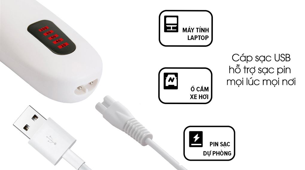 Máy trang bị pin sạc tích hợp, đi kèm cáp USB cho phép sạc linh hoạt qua củ sạc, laptop hoặc pin dự phòng, không cần dùng dây điện trực tiếp khi hoạt động.