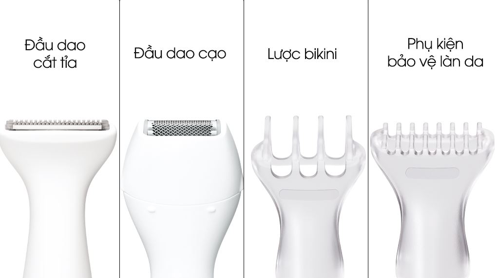 Bộ phụ kiện bao gồm: đầu cạo, đầu tỉa, lược bikini và tấm bảo vệ da, giúp cá nhân hóa trải nghiệm cạo theo từng vùng và từng loại da khác nhau.