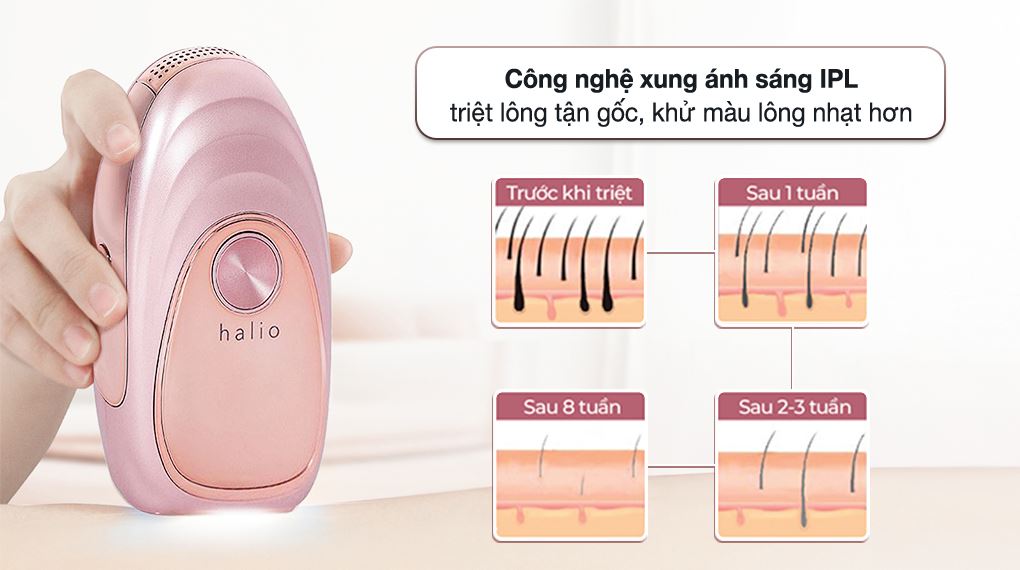 Máy triệt lông Halio IPL Cooling Hair Removal Device ứng dụng công nghệ IPL (Intense Pulsed Light) - ánh sáng xung cường độ cao tác động vào nang lông, làm gián đoạn chu kỳ phát triển, khiến lông mọc lại thưa và mảnh hơn theo thời gian.