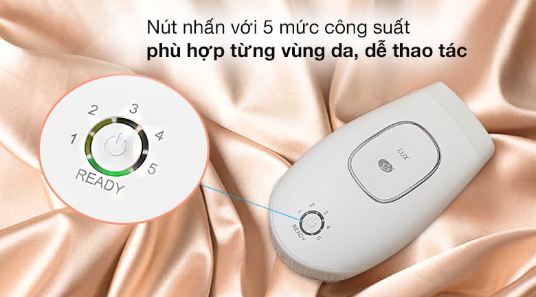 - Bước 6: Nhấn nút nguồn để chọn mức công suất phù hợp với loại da của bạn. Khi một mức được chọn, đèn báo sẽ hiển thị màu vàng ở mức đó.