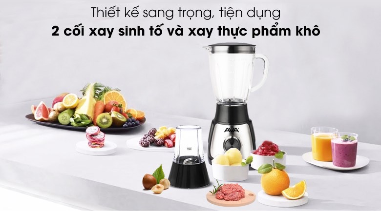 Máy xay sinh tố AVA BL1055-CB có thiết kế sang trọng, tiện dụng với 2 cối xay sinh tố và xay thực phẩm khô