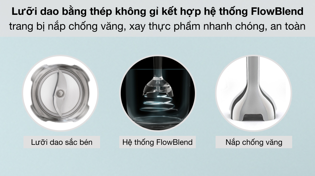 Lưỡi dao làm bằng thép không gỉ, an toàn, sắc bén, xay cắt thực phẩm mạnh mẽ, kết hợp với hệ thống FlowBlend giúp xay nhuyễn mịn các loại thực phẩm nhanh chóng, dễ dàng hơn, tiết kiệm công sức và thời gian.