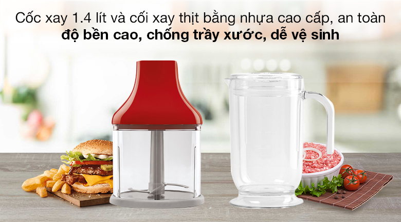 Bộ sản phẩm bao gồm: máy xay cầm tay, cốc xay sinh tố, cối xay thịt, dụng cụ cắt, cây đánh trứng, giúp xay sinh tố hoặc cháo nhanh chóng, đồng thời cũng giúp bạn thực hiện các công việc nấu nướng một cách dễ dàng hơn.