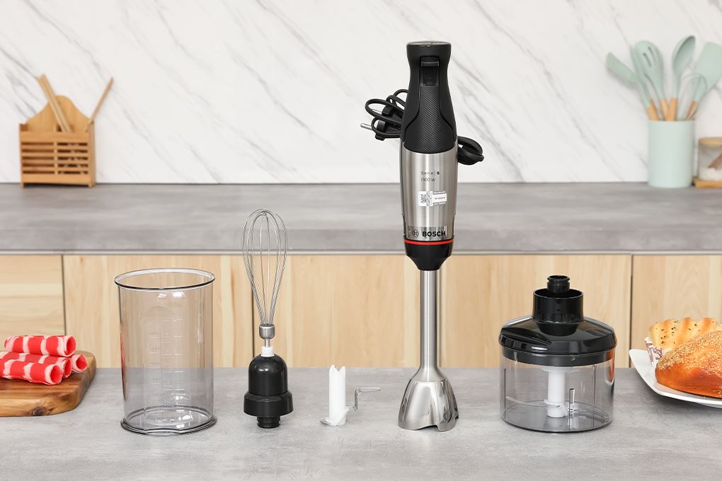 Với máy xay sinh tố cầm tay Bosch, bạn có thể xử lý nhiều loại nguyên liệu khác nhau một cách linh hoạt. Máy đi kèm cốc xay và cối nhỏ, phù hợp để xay sinh tố, xay hạt, xay gia vị như hành tỏi ớt nấm hoặc xay thức ăn. Ngoài ra, máy còn hỗ trợ đánh kem, đánh trứng và có thể xay đá, giúp bạn mở rộng khả năng chế biến trong gian bếp.