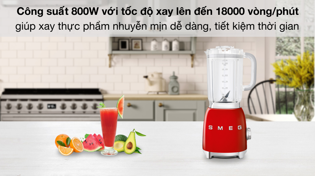 Máy hoạt động với công suất 800W cùng tốc độ xay 18000 vòng/phút, giúp bạn xay nhuyễn mịn thực phẩm nhanh chóng, tiết kiệm thời gian khi chuẩn bị bữa ăn hằng ngày.