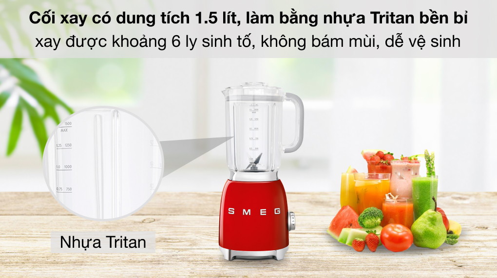 Dung tích cối 1.5 lít, đáp ứng tốt nhu cầu xay sinh tố cho gia đình 4 - 6 thành viên. Cối xay làm bằng nhựa Tritan bền bỉ, an toàn, đảm bảo sức khỏe cho người dùng. Trên cối có thiết kế vạch chia tiện lợi, giúp bạn có thể đong đếm nguyên liệu chính xác khi sử dụng.