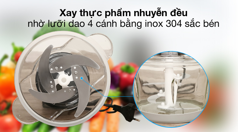 Thiết kế dạng tầng giúp lưỡi dao xay nhanh và đều thực phẩm bên trong cối cách nhanh chóng và dễ dàng hơn. Lưỡi dao làm bằng inox 304 đảm bảo an toàn trong vệ sinh thực phẩm.