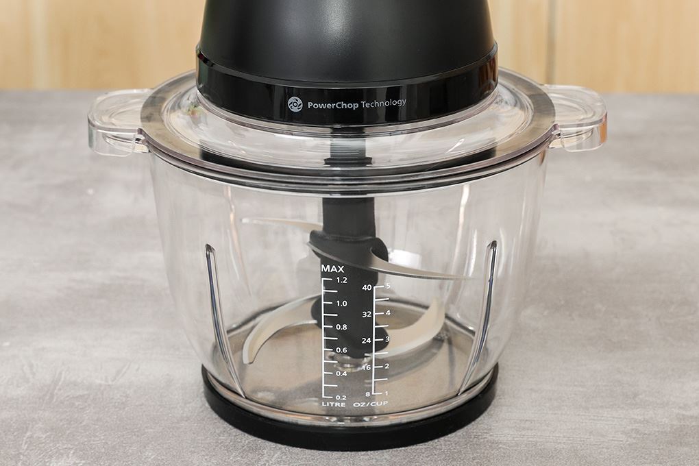 Bên trong là lưỡi dao bằng thép không gỉ sắc bén, có thể tháo rời khi cần vệ sinh, giữ được độ bền và hạn chế gỉ sét theo thời gian. Philips tích hợp công nghệ PowerChop giúp tối ưu cách lưỡi dao cắt và xoay trong cối, nhờ đó thực phẩm được xay nhuyễn và đồng đều hơn.