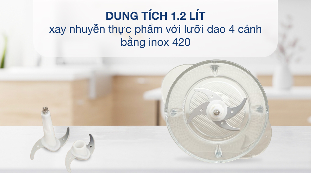 Sản phẩm gồm 1 cối thủy tinh dung tích 1.2 lít có thể xay thịt, rau củ, hạt, gia vị (hành, tỏi, ớt, nấm,...).