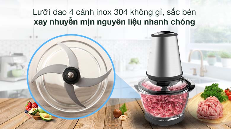 • Lưỡi dao 4 cánh bằng inox 304 không gỉ, sắc bén xay nhuyễn mịn thực phẩm.