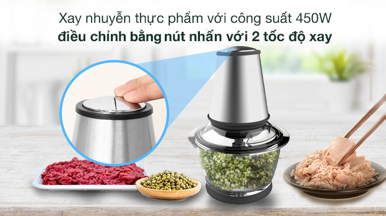 Máy hoạt động với công suất 450W và 2 tốc độ xay, giúp xay thực phẩm nhuyễn mịn, nhanh chóng và hiệu quả