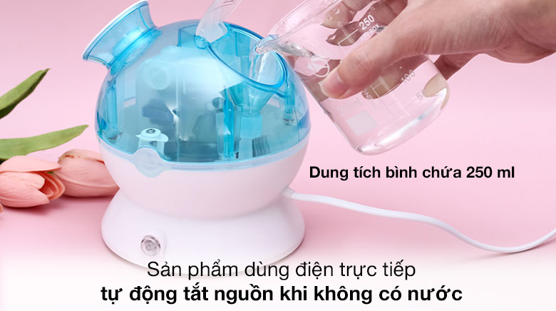 Máy xông hơi mặt dung tích bình chứa 250 ml, không cần châm nước nhiều lần, khoang chứa có đánh dấu mực nước max, khoảng 30 phút xả hết khoang chứa.