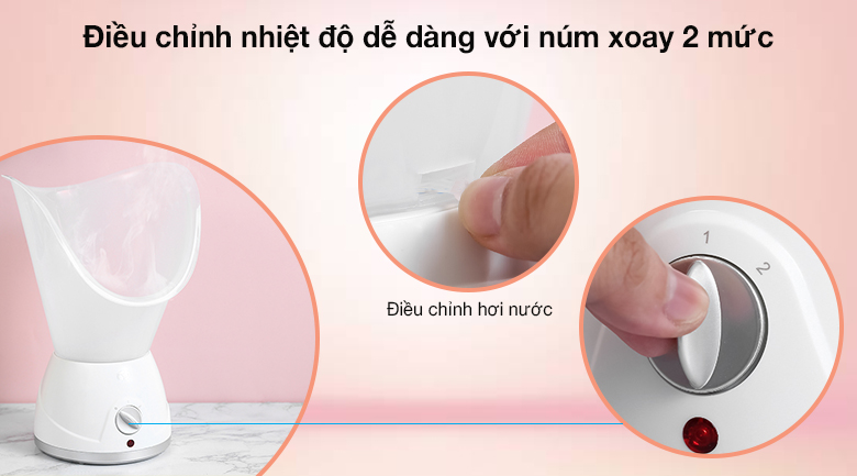 Có núm xoay để chỉnh 2 mức nhiệt độ, tùy theo nhu cầu bạn chọn mức nhiệt xông hơi phù hợp