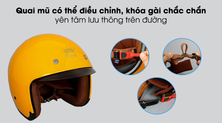 Mũ bảo hiểm 3/4 có kính size L Royal M139 vàng nổi bật, phù hợp với chu vi vòng đầu 55 - 57 cm, trang bị mốp xốp dày 3.6 cm và quai mũ chắc chắn, đảm bảo an toàn cho bạn khi tham gia giao thông trên đường.