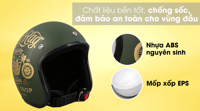 Sử dụng chất liệu nhựa ABS nguyên sinh làm vỏ mũ giúp tăng khả năng chịu lực, va đập, chống ăn mòn. Phần ruột bằng mốp xốp EPS dày 3 cm cố định vùng đầu, cho hiệu quả chống sốc, bảo vệ vùng đầu hiệu quả trong mọi hoàn cảnh.